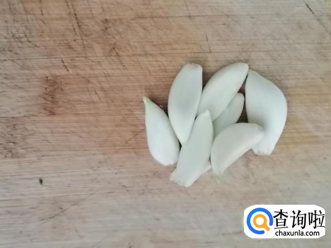 取适量大蒜剥皮洗净,把蒜瓣放在菜板上,用刀背先拍扁,然后剁成末待用,蒜量多少根据自身喜好定。