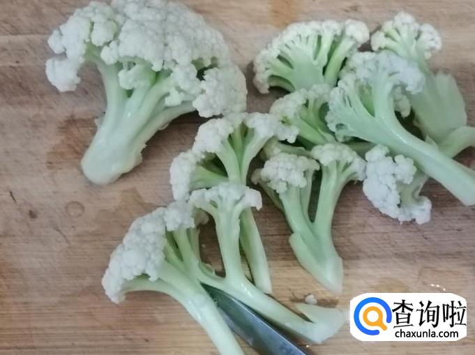 取适量菜花放入洗菜盆中用清水洗净,把洗净的菜花放在案板上,切成菜花块待用,因为菜花杆部分硬,所以用小刀把杆部分再划几刀。