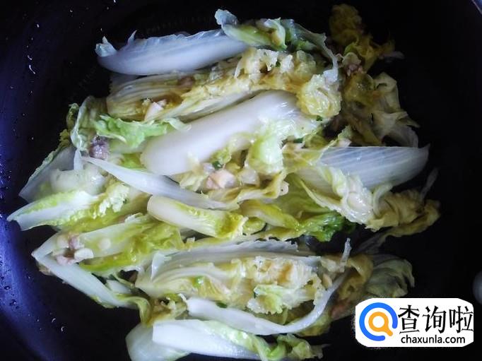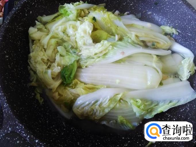 再开火下油,放娃娃菜进去,加适量的盐翻炒至八成熟铲上碟子。