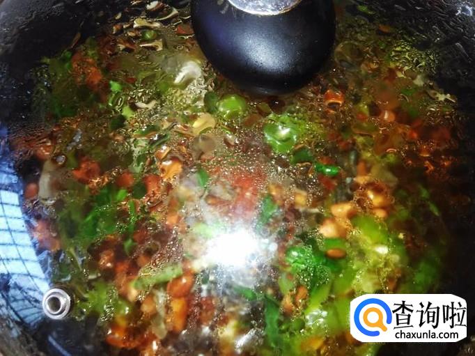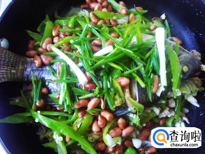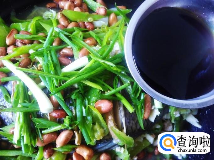 然后把青椒、花生铺上去,再浇适量的生抽。