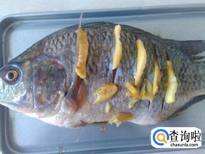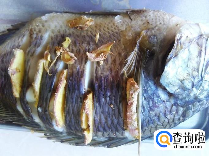然后用姜片插到鱼缝里腌制十几分钟。