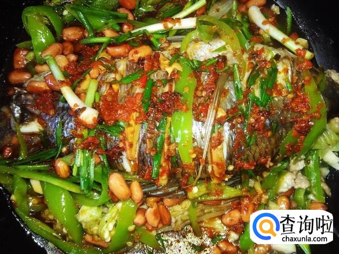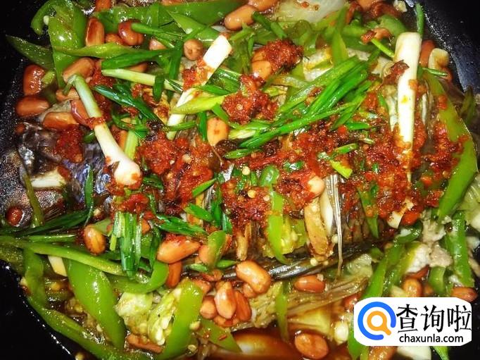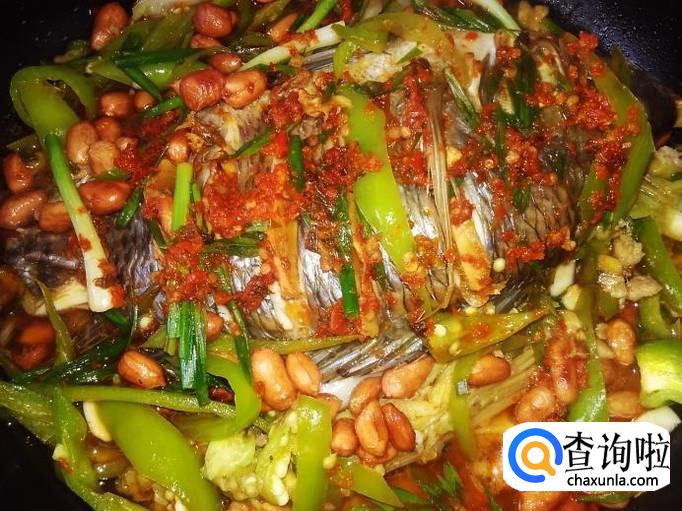 罗非鱼1条,娃娃菜200克,花生150克,青椒100克,姜丝适量,生抽适量,自做的酸梅紫苏辣椒酱1勺。