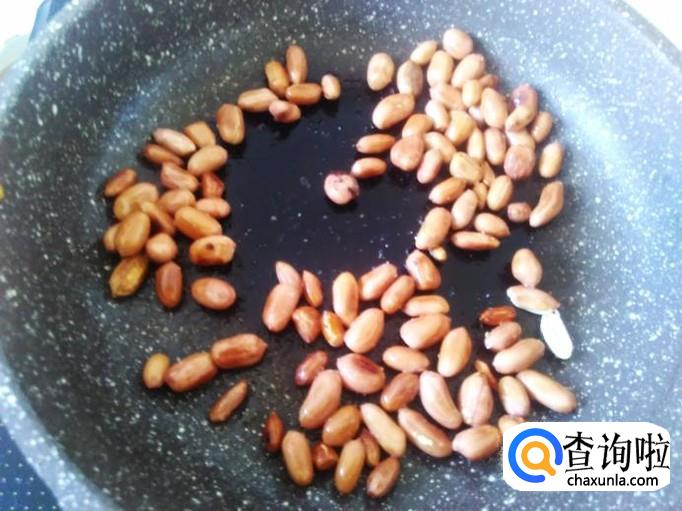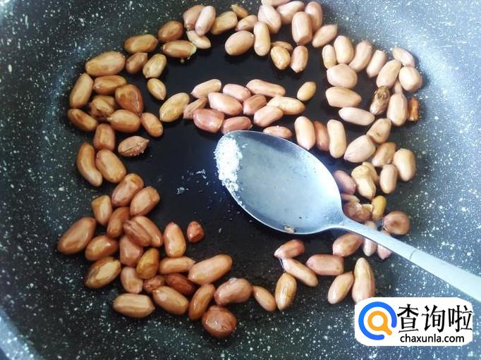 再开火放花生进去,然后不停地翻炒,炒到花生变成焦黄色下适量的油、盐翻炒10秒左右铲上碟子。