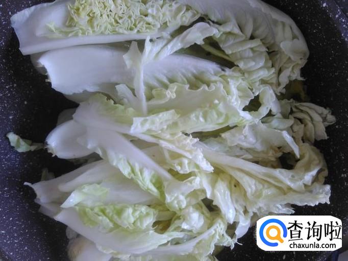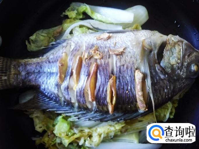 然后用一个大点的平底锅,首先把娃娃菜摆在锅底,再把烤好的鱼铺上去。