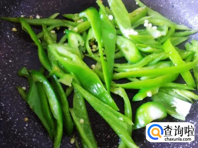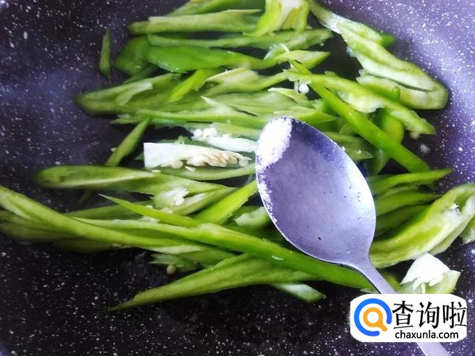 开火下油,放青椒进去加适量的盐翻炒至软,然后铲上碟子。