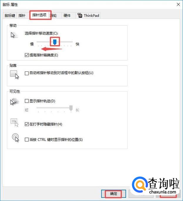 弹出的界面,我们点击指针选项,然后我们将图示中的滑动按钮向左滑动调慢,之后我们点击应用,然后点击确定就可以解决这个问题了。