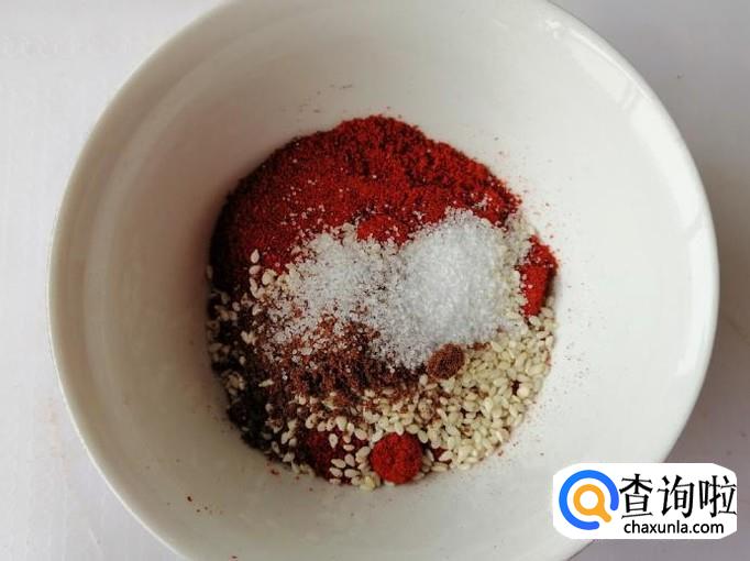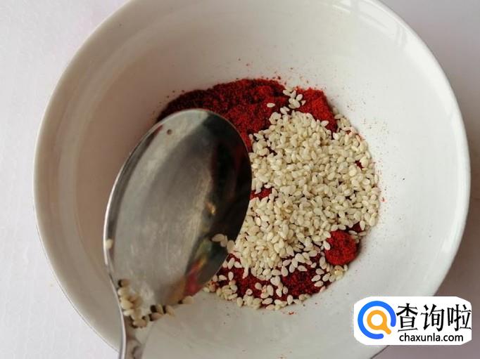 把准备好的白芝麻放入辣椒面碗中,加入一勺五香粉,再加入备好的一勺食盐,所有食材都放好备用。