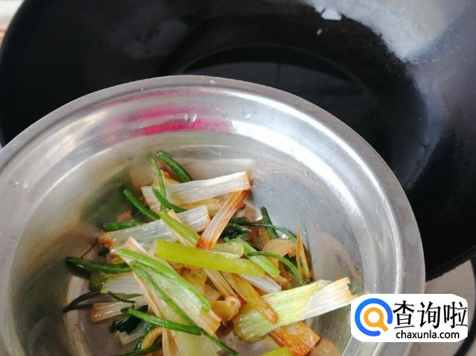 炒锅放油,油热后加入备好的葱、香菜杆、姜片用筷子拨动炸出香味,炸至葱、香菜、姜片微黄捞出,剩下热油就可以泼辣子了。