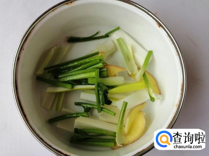 取适量新鲜的大葱,用清水把葱洗净,然后把葱切成葱段,适量香菜杆,用清水洗净切成香菜段待用,取适量姜洗净切片备用。