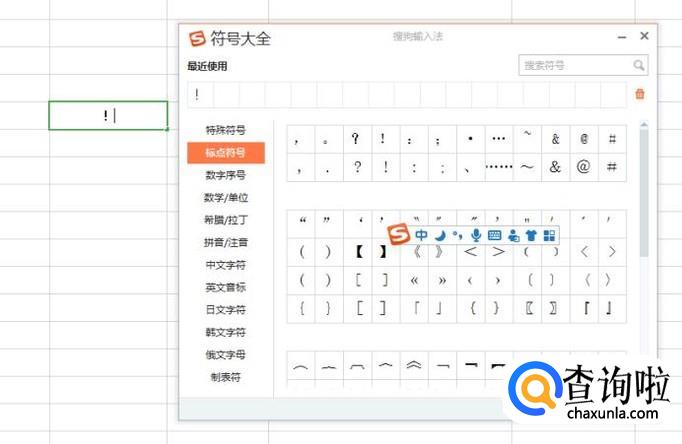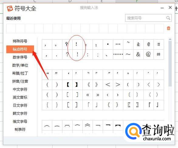 选择左方的“标点符号”,可以很直观的看到右边有“感叹号”,点击感叹号就可以了。