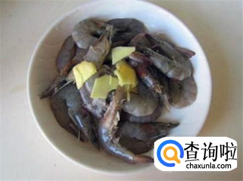 把大虾放进碗里,加上料酒、生姜片葱段,倒一些生抽食盐腌制一下。