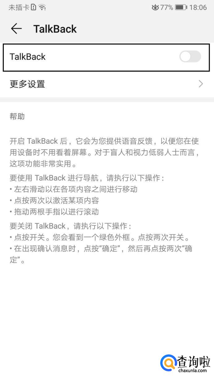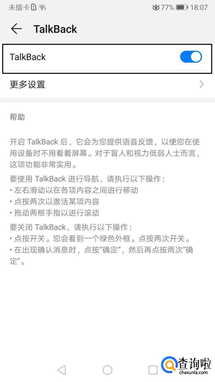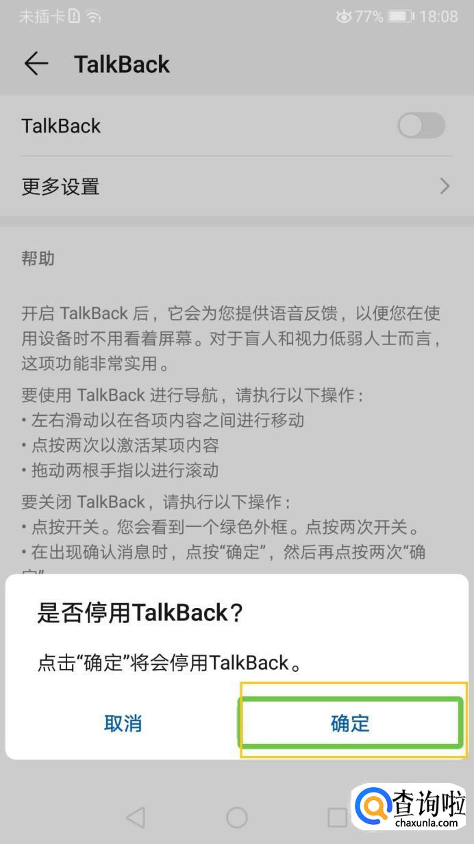 进入TalkBack设置页面以后,双击"确定“,即可关闭。