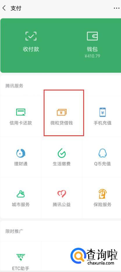 微信的借呗叫微粒贷,进入微信后,点击右下角我,然后选择上方的支付。