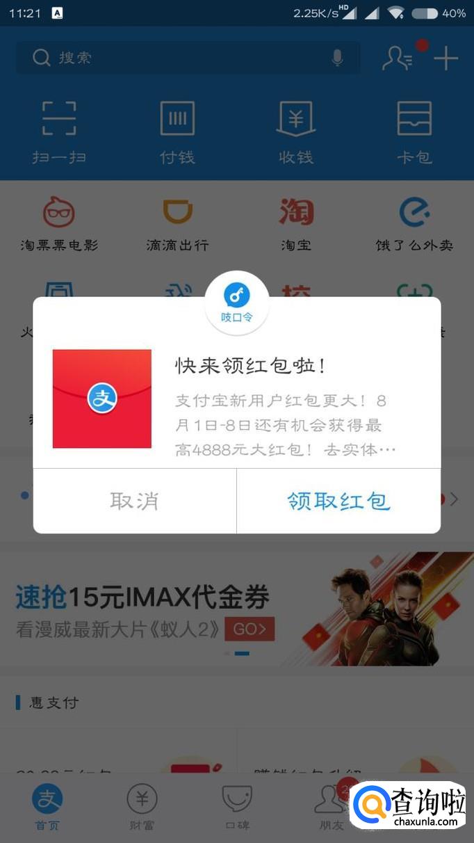复制吱口令然后打开支付宝,点击“立即领取”。