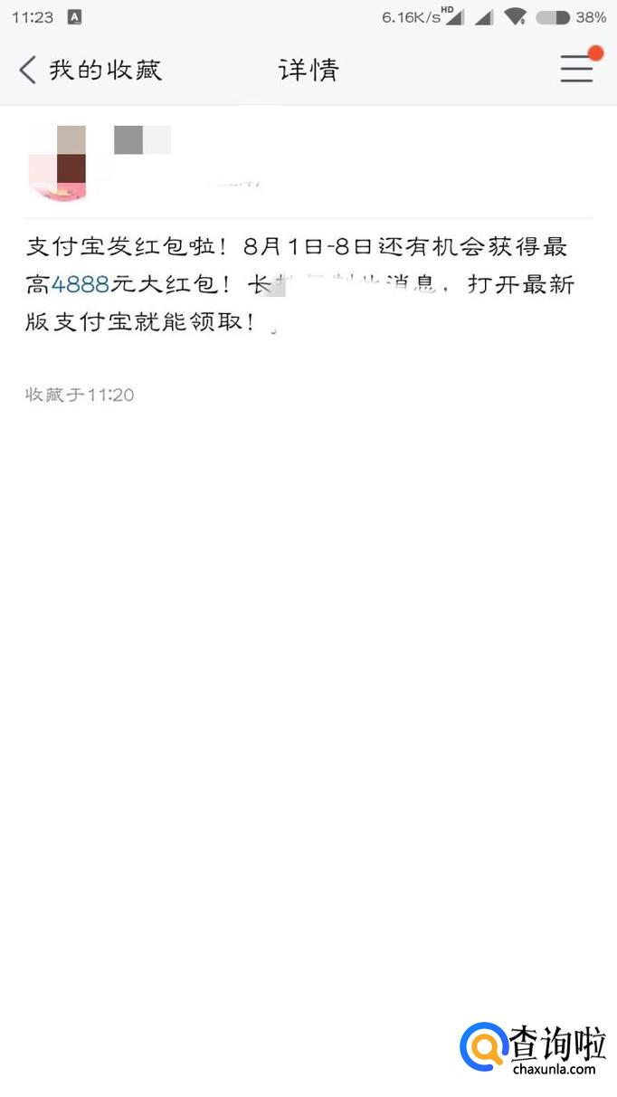 首先我们需要找到一个好友,让他把支付宝余额宝红包的吱口令发送给我们。