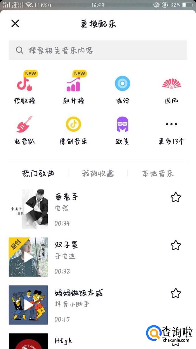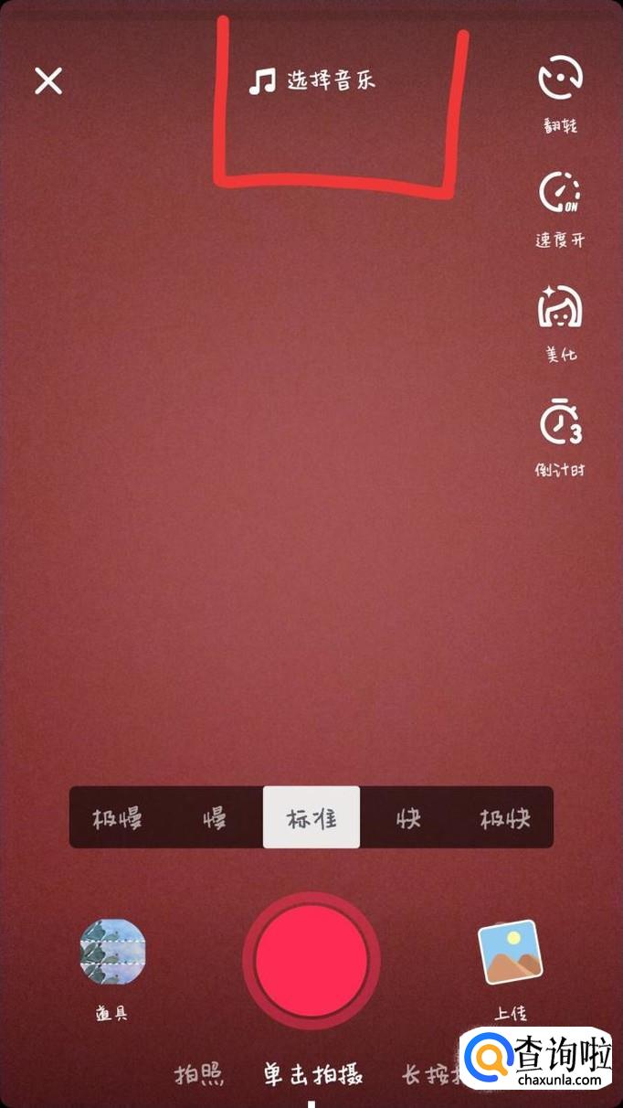 在拍摄页面,点击屏幕上方的选择音乐,在选择音乐界面选择自己喜欢的音乐即可。