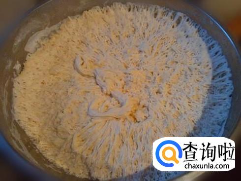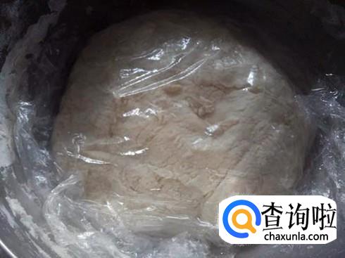 然后倒入面粉里,和成面团放到面盆里,用保鲜膜盖上,然后放到比较暖和的地方,也可以放在阳光下。等面团膨胀起来,就可以了。
