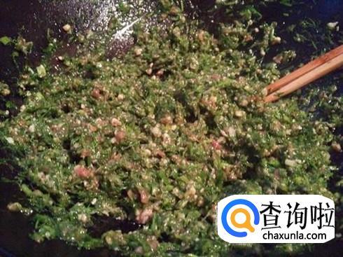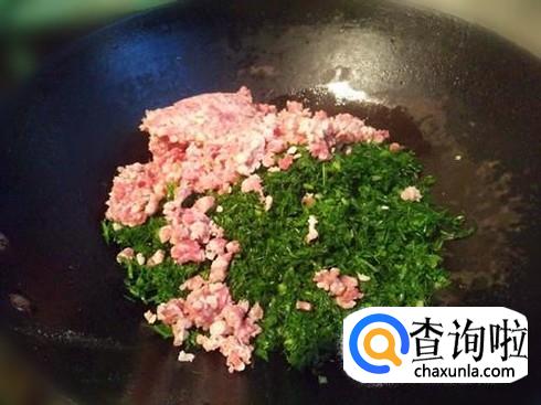等锅里的油变凉后,放入牛肉馅儿,荤香,用筷子搅拌均匀。