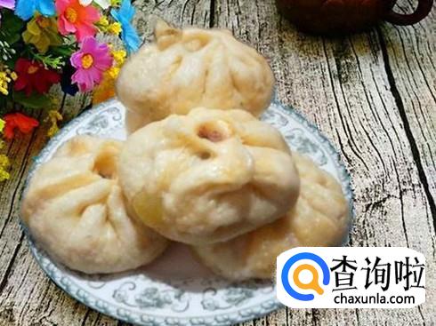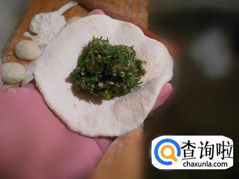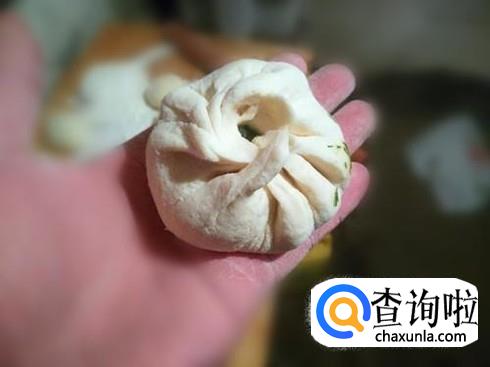 我们把小面团擀薄,然后放上馅料,做成包子状。