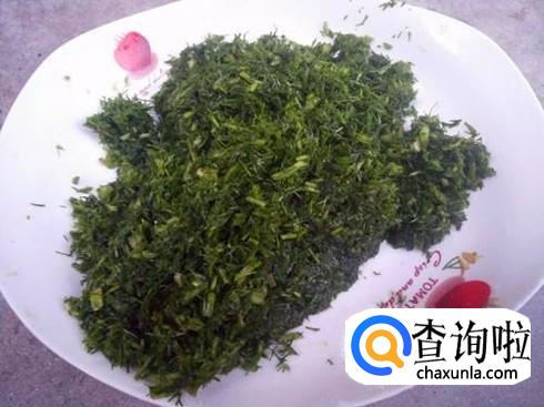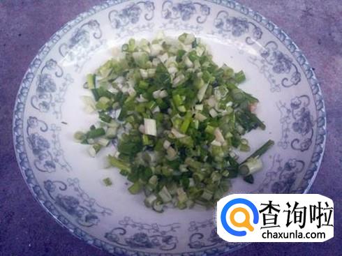 我们把葱切成葱花,把荤香洗净,把水沥干后切碎。