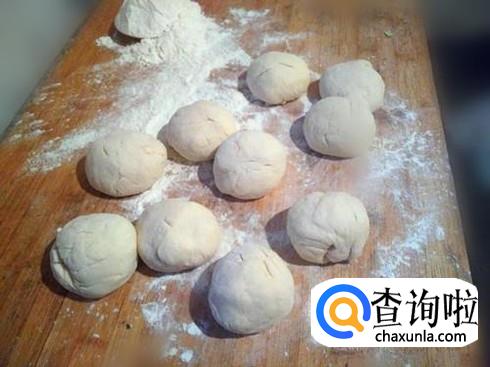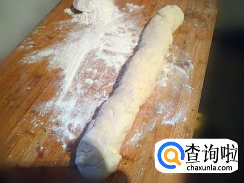 接着我们把发好的面团里再加入一些面粉,揉成面团,搓成长条,然后揪成小面团。