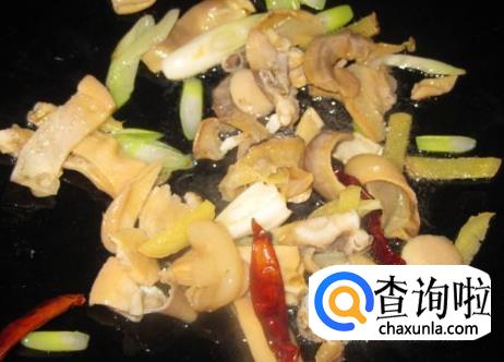 留一些油在锅里,把蚌肉倒进去快速翻炒,倒入青蒜和炸好的干红椒翻炒。