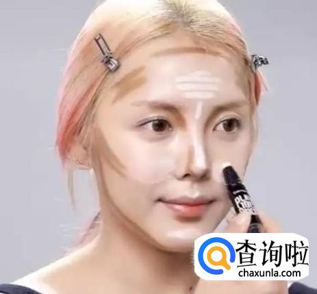 瘦脸妆最重要的就是我们的修容棒了,我们用使用深色的修容棒涂抹在鼻影,侧影,以及我们的额头和颧骨,然后轻轻的推开,也可以用我们的粉扑来帮忙。