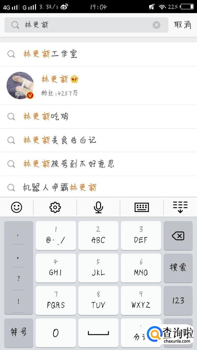 小编这里以关注林更新的微博为例,在搜索栏里输入“林更新”,就会弹出跟林更新相关的微博