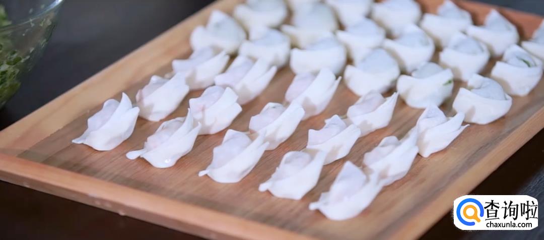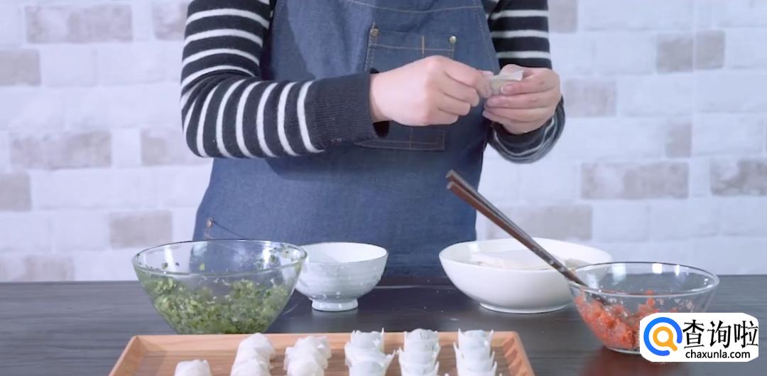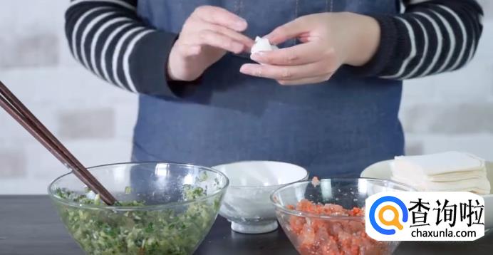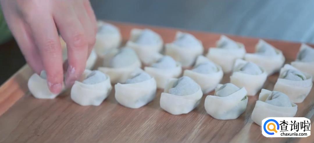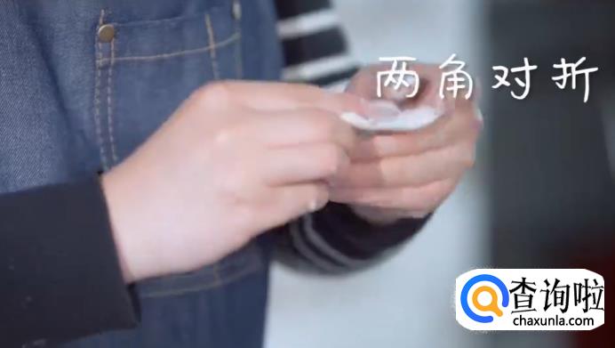 将馅料放入馄饨皮中,将混沌皮两角对折,蘸一点水,捏紧即可。