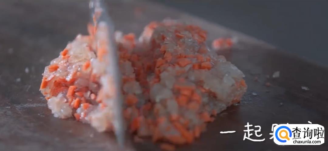 胡萝卜剁碎,将虾仁切块,再将虾仁和胡萝卜混在一起剁成肉馅。