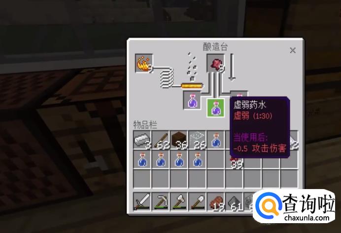 过几秒钟后,粗制药水就酿好了,我们再放上发酵蛛眼,虚弱药水就酿造好了。,等待药水酿造完毕,药水的有效时间从一分三十秒变成了4分钟。如果直接喝掉那么我们自己就会被虚弱了。所以要把药水变成喷溅型的,才能有效使用。