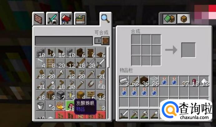 然后我们合成十个“蛛眼”——需要“蛛眼、灰蘑菇和糖。蜘蛛——我们可以通过打蜘蛛来获得;糖——用甘蔗来合成;蘑菇——在矿洞中有几率生成,或者从蘑菇岛、深色橡木林中获得。