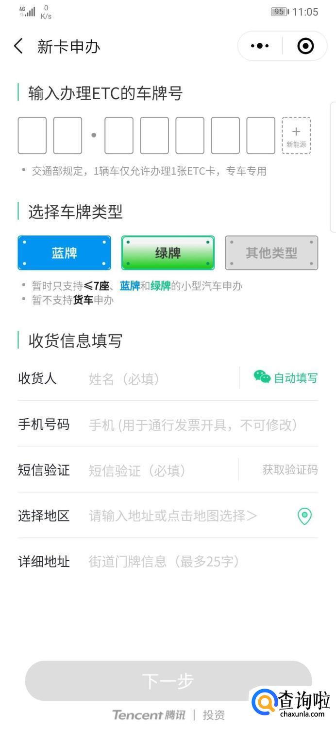 点击之后,如下图所示,需要上传车牌号、收货人、收货地址、手机号码等信息,再点击下一步。