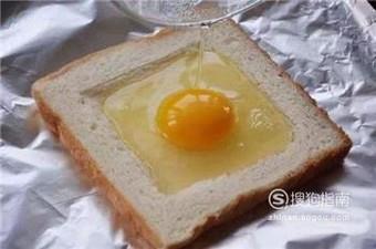 我们首先在吐司表面上挖出一个洞,只要表面一层就可以,不宜穿破,可以放下一个鸡蛋就可以。