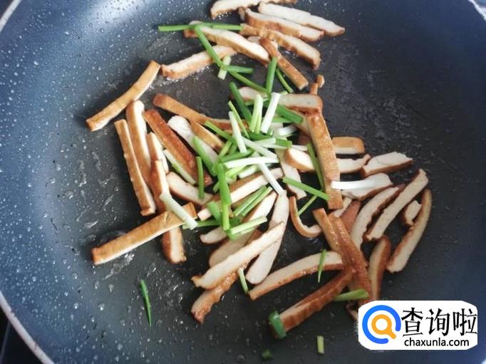 豆干炒至表皮微皱后,葱段下入锅中翻炒
