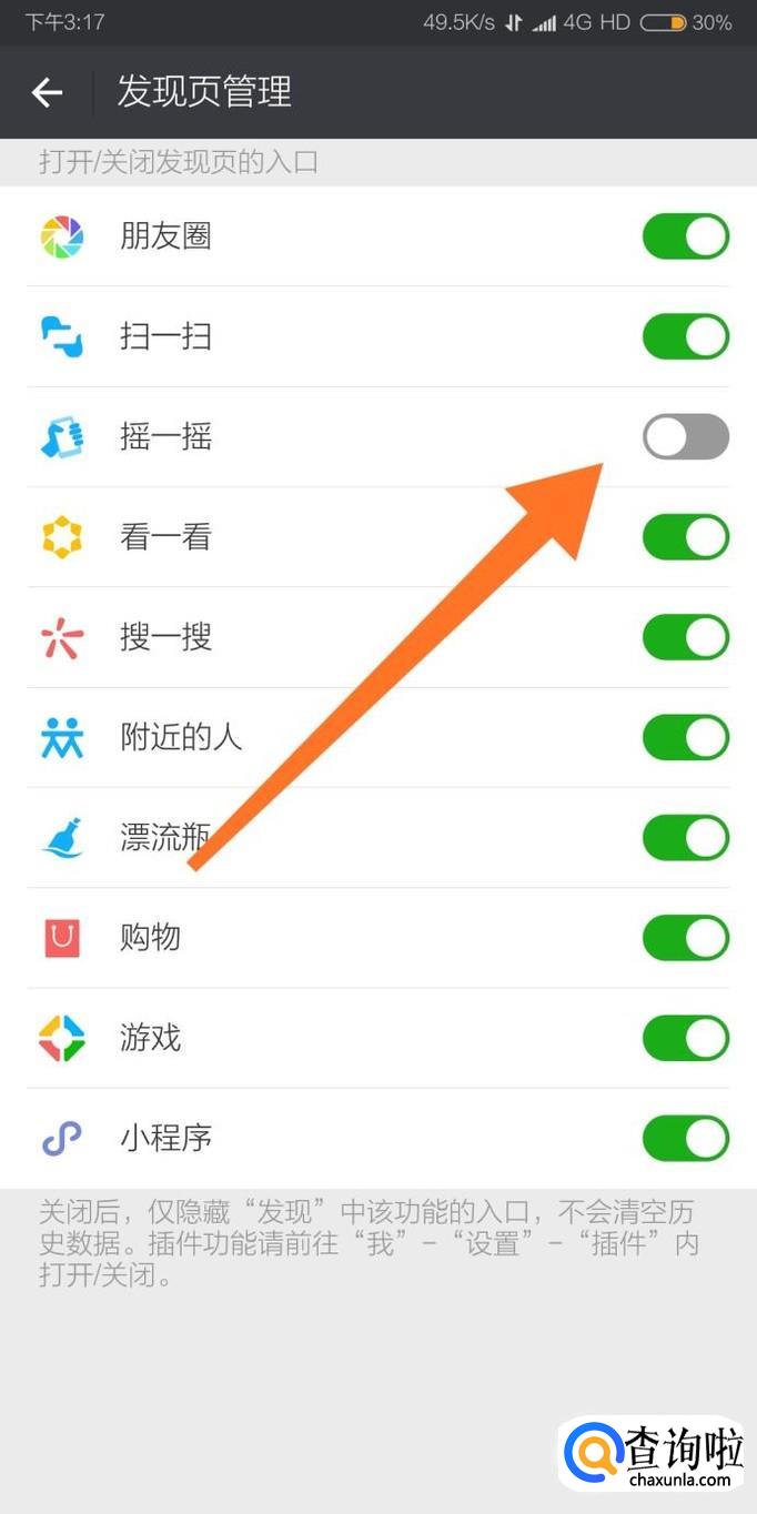 在“发现页管理”可以关闭和开启“发现”页里面的功能。最后我们可以打开微信“摇一摇”的选项,设置好之后,“摇一摇”功能又会出现在微信当中。
