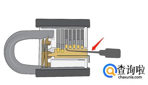 把扭力扳手夹在锁眼的下半部分。明确锁芯要朝哪个方向转锁才能开。