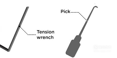 买个开锁器和扭力扳手,不同规格的开锁器有特定的用处。扭力扳手或者又叫转矩扳手,是用来借着使劲儿拧锁芯的。专业级的镐和扭力扳手一般都是成套出售的(如图),但是很多开锁爱好者的工具都是自己攒(cuan)的。可以参见下面的“所需工具”部分,里面有这方面的介绍。