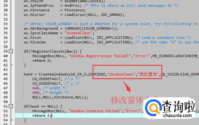 然后我们打开main.cpp文件,如下图所示,在44行的位置修改窗体的名称