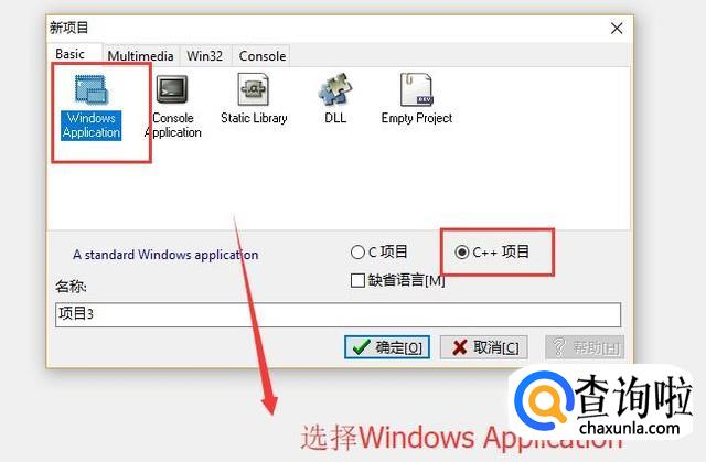 接下来在弹出的新建项目界面选择Windows Application选项,然后勾选C++选项,如下图所示