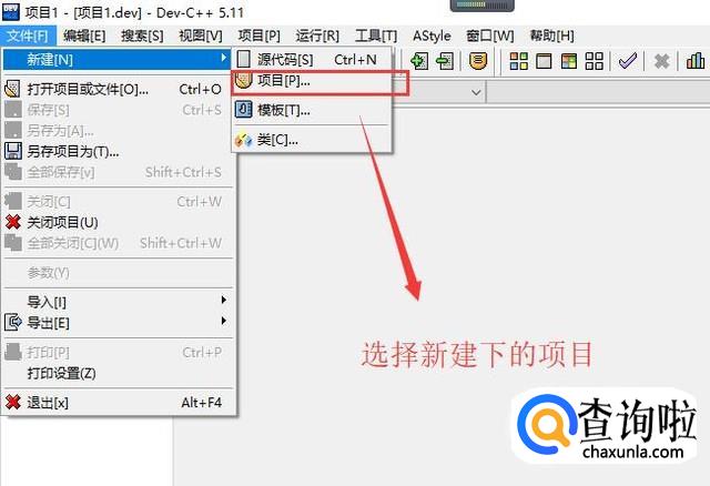 首先打开Dev C++软件,点击顶部的文件菜单,选择新建下面的项目选项,如下图所示