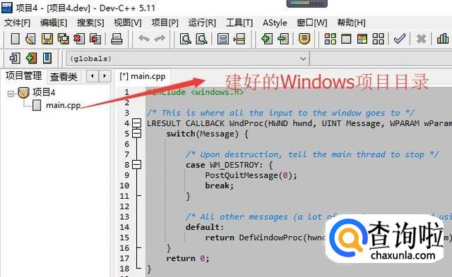 接着我们就会在Dev C++中看到如下图所示的目录,这个代表Windows窗体应用基本结构已经创建好,如下图所示