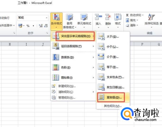 弹出的界面,我们将鼠标放在突出显示单元格规则,之后我们点击重复值;