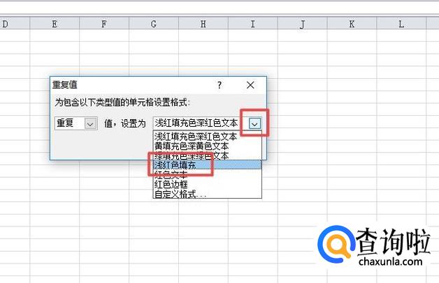 然后我们点击设置为边上的下拉箭头,弹出的界面,我们点击浅红色填充;
