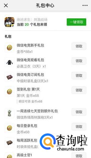 进入绝地求生:刺激战场的礼包中心界面,点击不同礼包的“领取”按钮,即可领取对应的游戏礼包,当然也可以直接点击“一键领取”按钮对所有礼包进行领取。