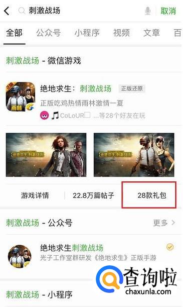 首先,打开微信,在上方的搜索栏中输入“刺激战场”,在搜索结果中,点击带有“微信游戏”标识词条右下角的“**款礼包”选项。