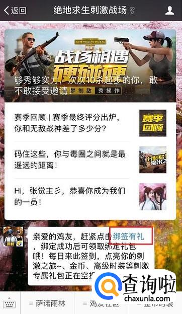 在弹出的公众号消息中点击“绑签有礼”按钮,按要求对游戏角色进行绑定,即可获得对应的游戏礼包。