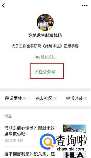 在搜索结果中点击“刺激战场-公众号”,对该公众号进行关注,并进入该公众号界面。