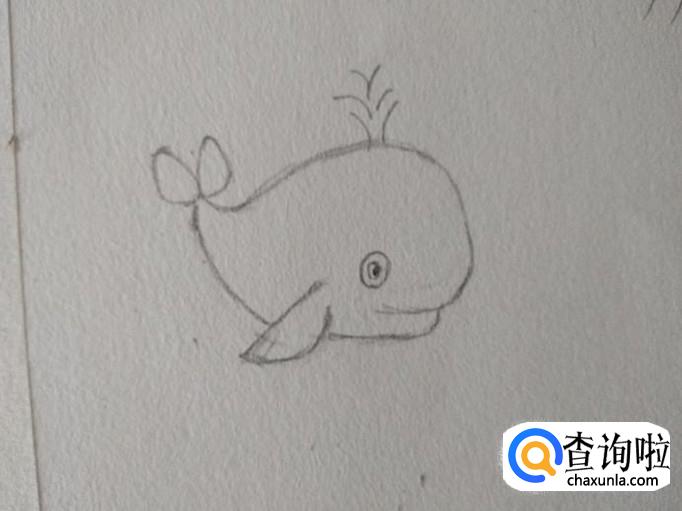 画个鲸鱼。鲸鱼也是很简单的。尾巴是两个变形的等边三角形,鲸鱼的身体是一条弧线。鱼头是个圆,然后用线条找准轮廓。画上眼睛,还有喷出的水就可以了。