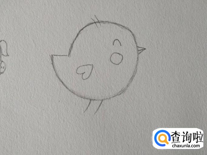 画个小鸟。小鸟就是由两个半径不一样的圆形组成的。画上尖尖的嘴和两个头毛,再画上小脚。